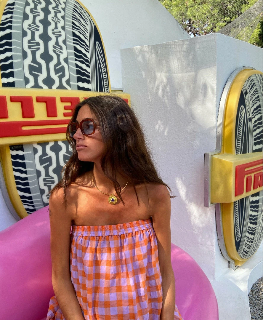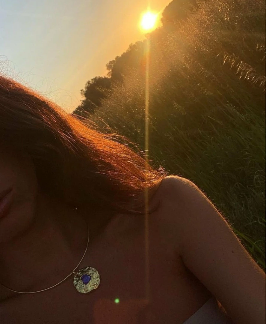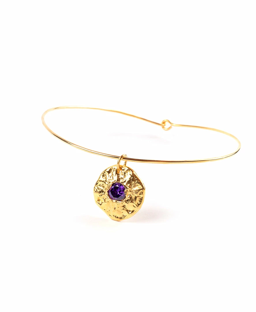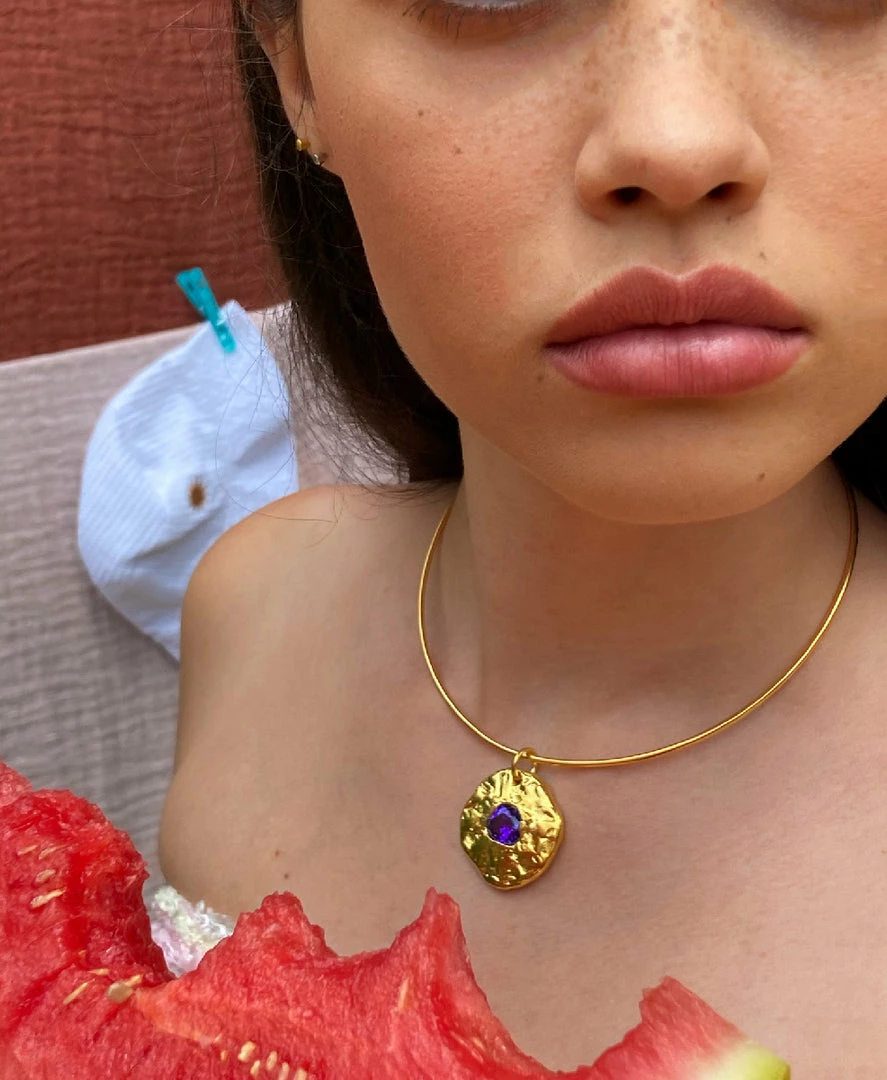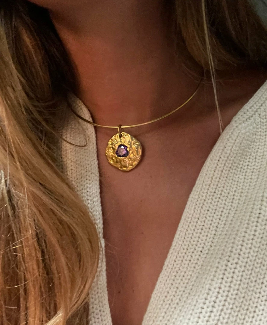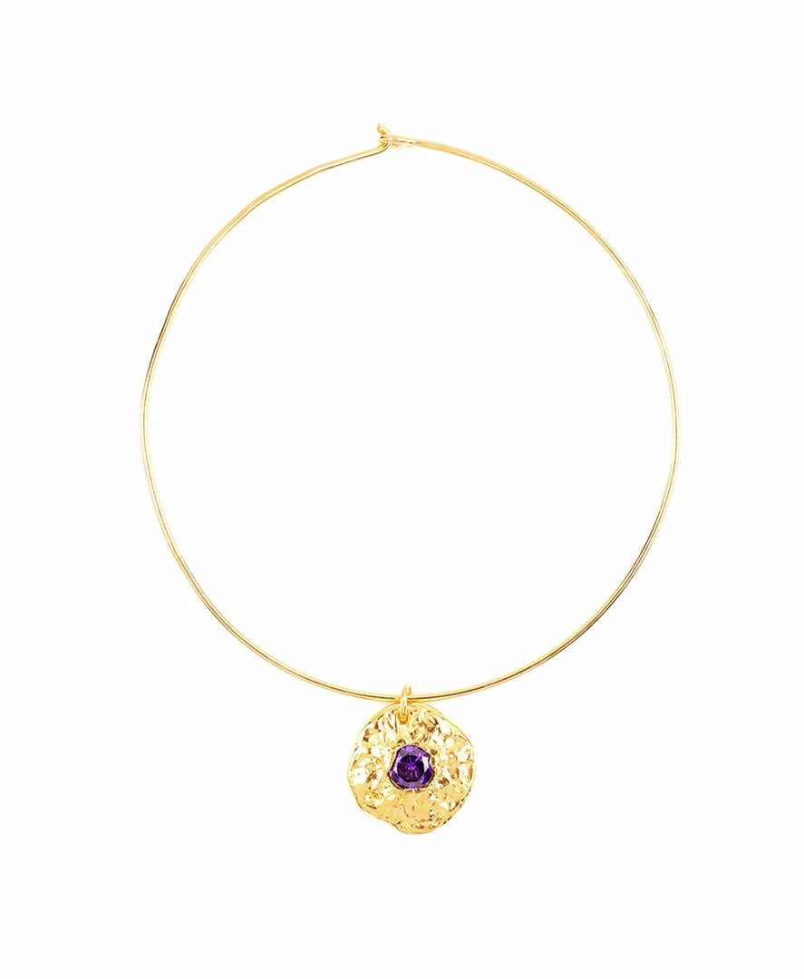 The Kaia Charm Choker features a stunning gold wire necklace and hammered coin-purple stone charm. This piece draws inspiration from the full moon.