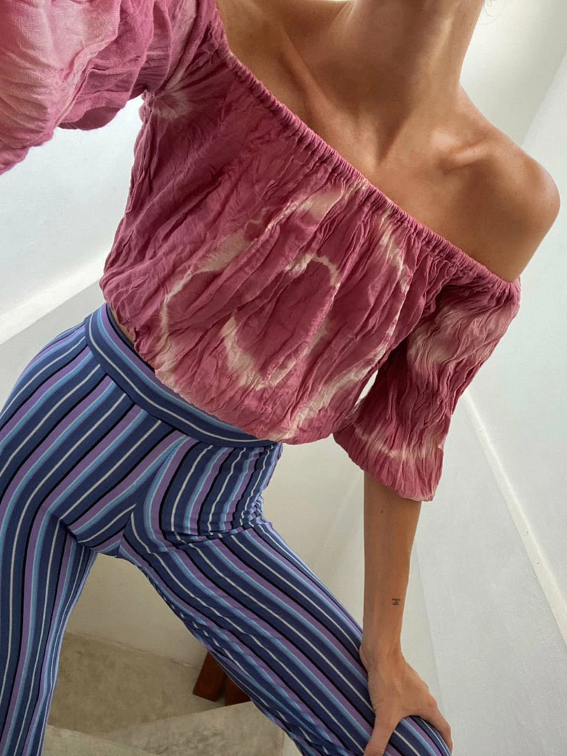 Every summer needs a little bit of Tie Dye in it. The off shoulder puffy slevees top comes in Baby Blue, Yellow, Green and Pink to match with any of the Pants in the collection and give that comfy yet funky look. Easy and Light perfect for your everday looks.