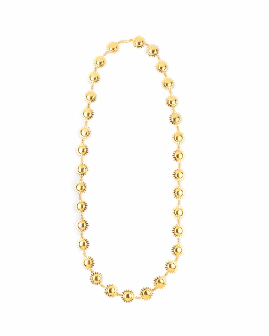 Our favorite Bandolera style is coming this summer featuring our dearest Sun. A full long necklace that can also be a funky belt made of consecutive gold platted suns. Forever with the sun. Feel warm and give your looks a tropical and summer feeling anywhere you go.