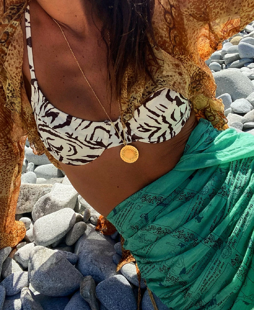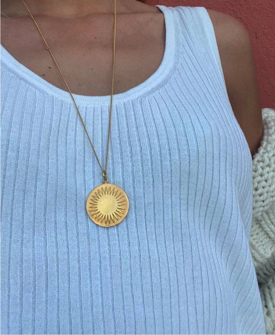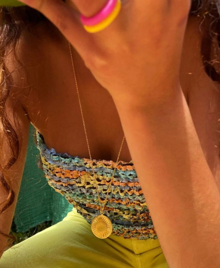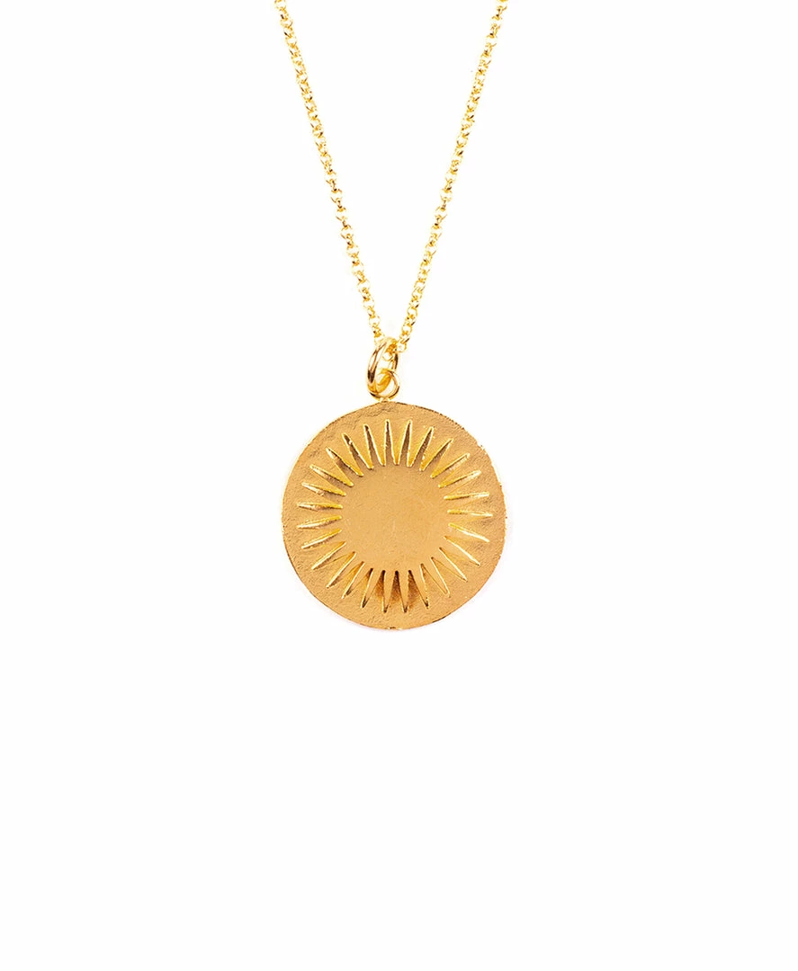 A classy, elegant gold necklace that’s always in fashion. It features a stunning gold chain with a gorgeous pendant dangling at the bottom. This all-season piece will complete any ensemble. You can wear the Sun Charm anywhere, whether you’re going on a beach trip or a cocktail event.