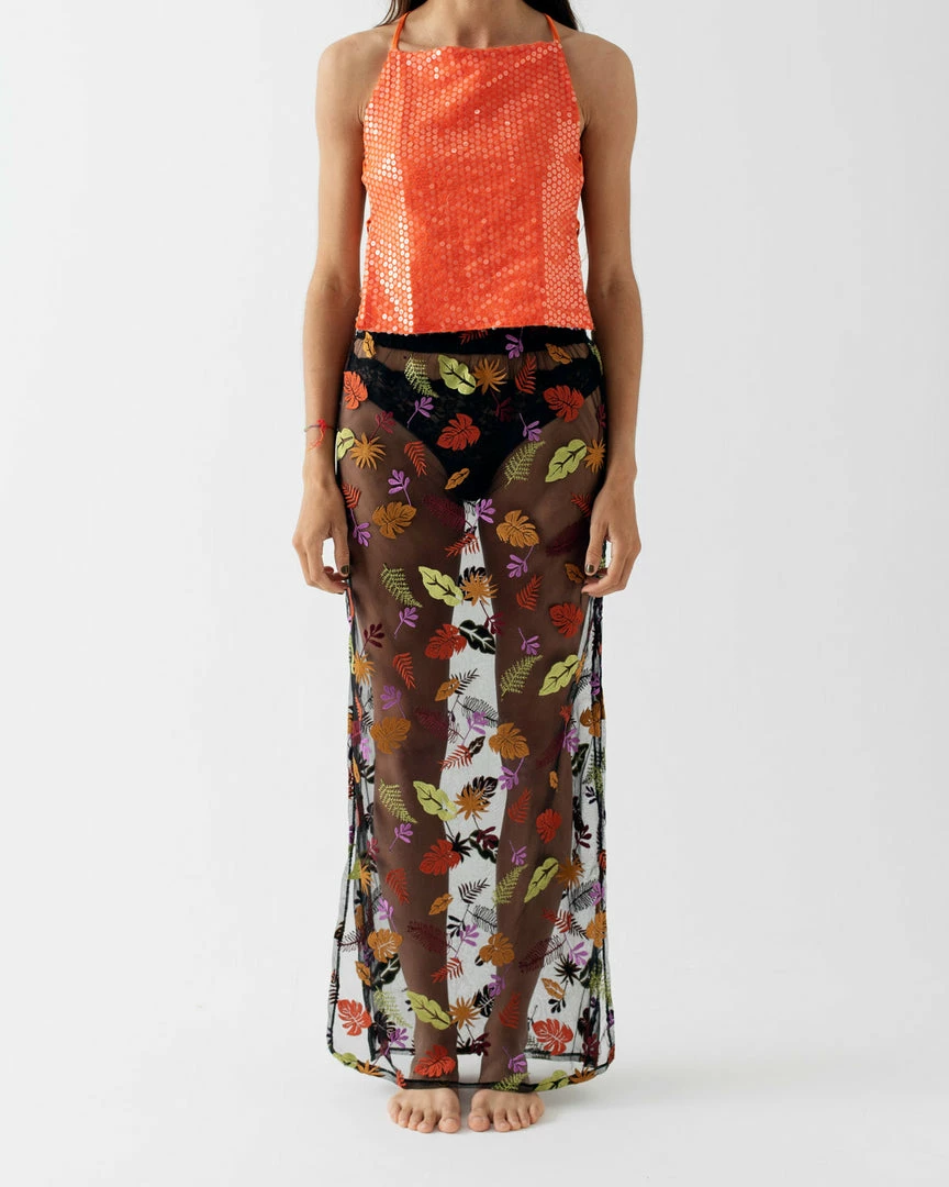 Magic fairy skirt for summer lovers.Magic fairy dress for summer lovers. A Complete long see-through Skirt with tropical flowers embroided details all around and side cuts on the bottom. Feel warm in this island style skirt going to the beach or having a dancing night out. Style with big statement earrings and Lili top.