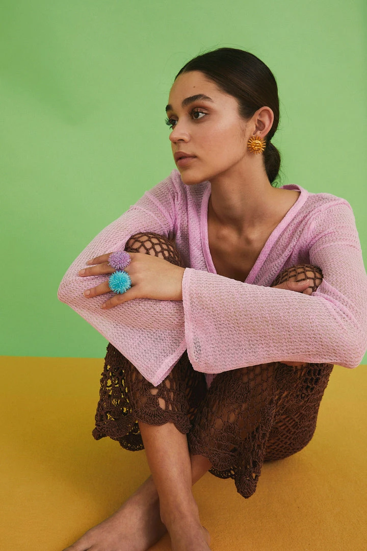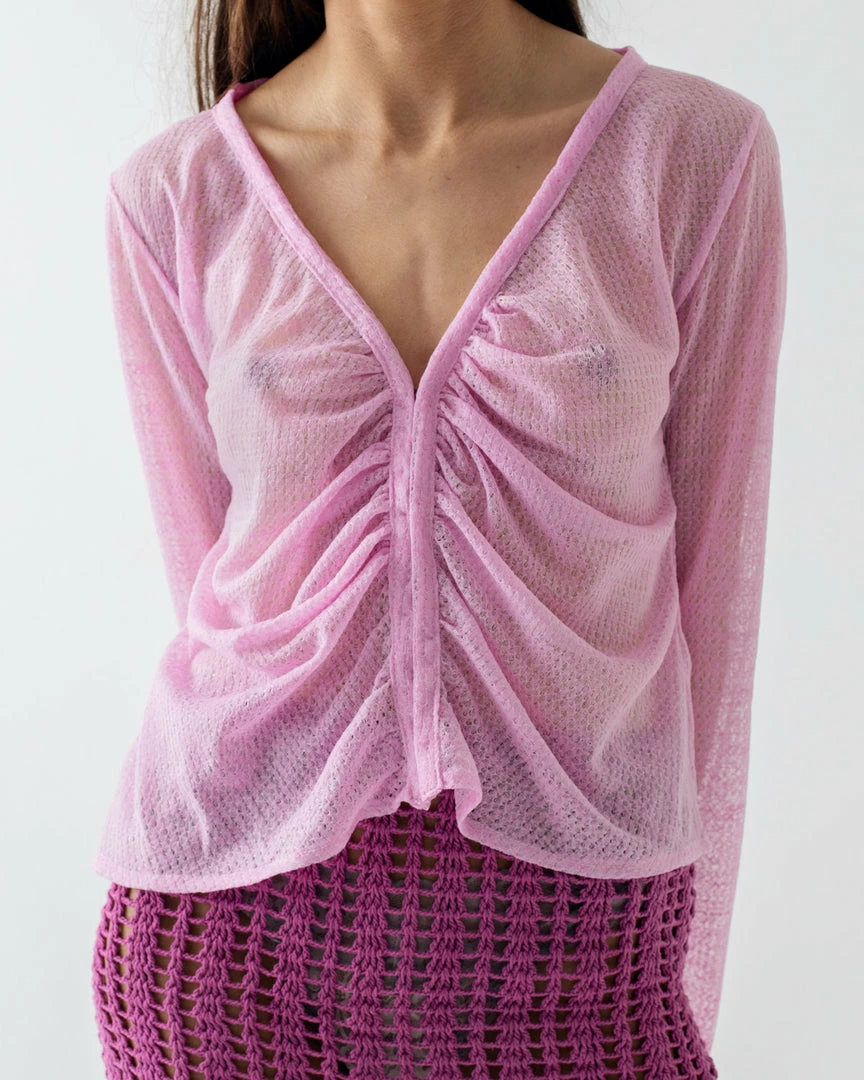 Vintage style See-Through Shirt with wrinkled effect around the chest is bottomed down with tiny hooks. Comfy and breezy elegant shirt for this summer. Style with our crochet pants and skirt for a perfect match.