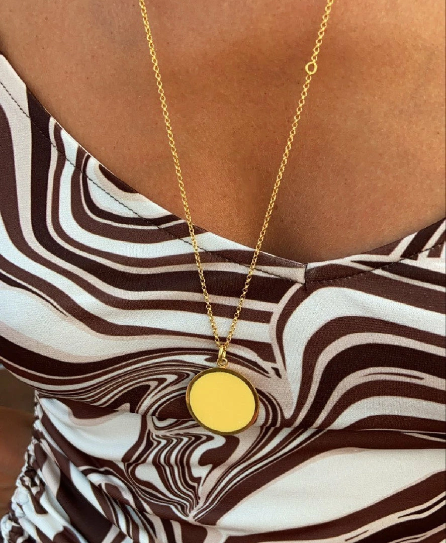 Feel closer to the sun with out Lilo Yellow Pendant. This colored medallion serves as the perfect addition to any summer necklace. Brighten up your outfit without sacrificing class. Our Lilo Pendant is available in pink and black.