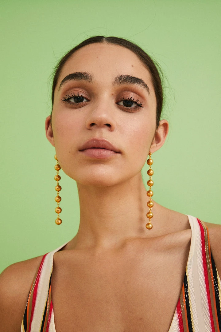 Long fun earrings that swings with every move. Coming in golden platted beads. Perfect for the nights you will spend on the dancefloor.
