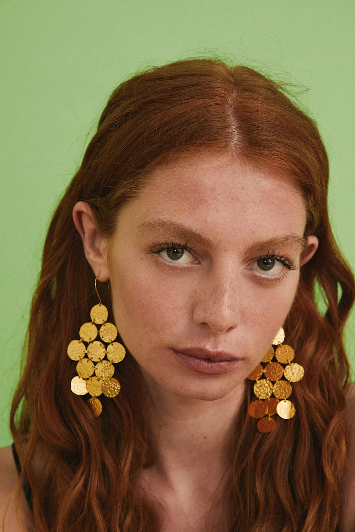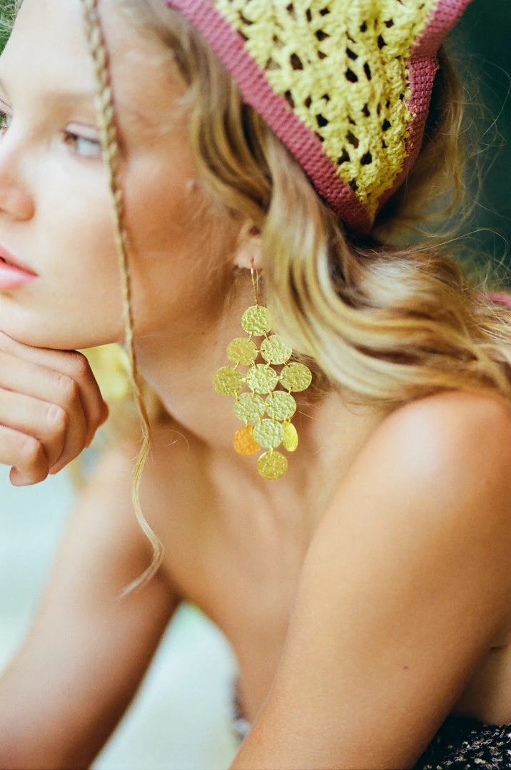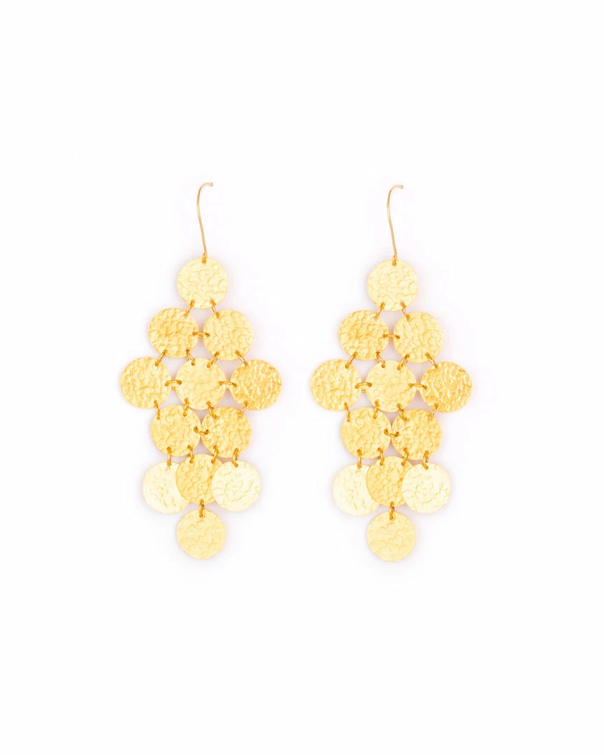 Hand carfted circle gold platted shapes forming a rombo shape inspired by the 70’s style. Big statement earrigns ready to hit the dancefloor with all your outfits.