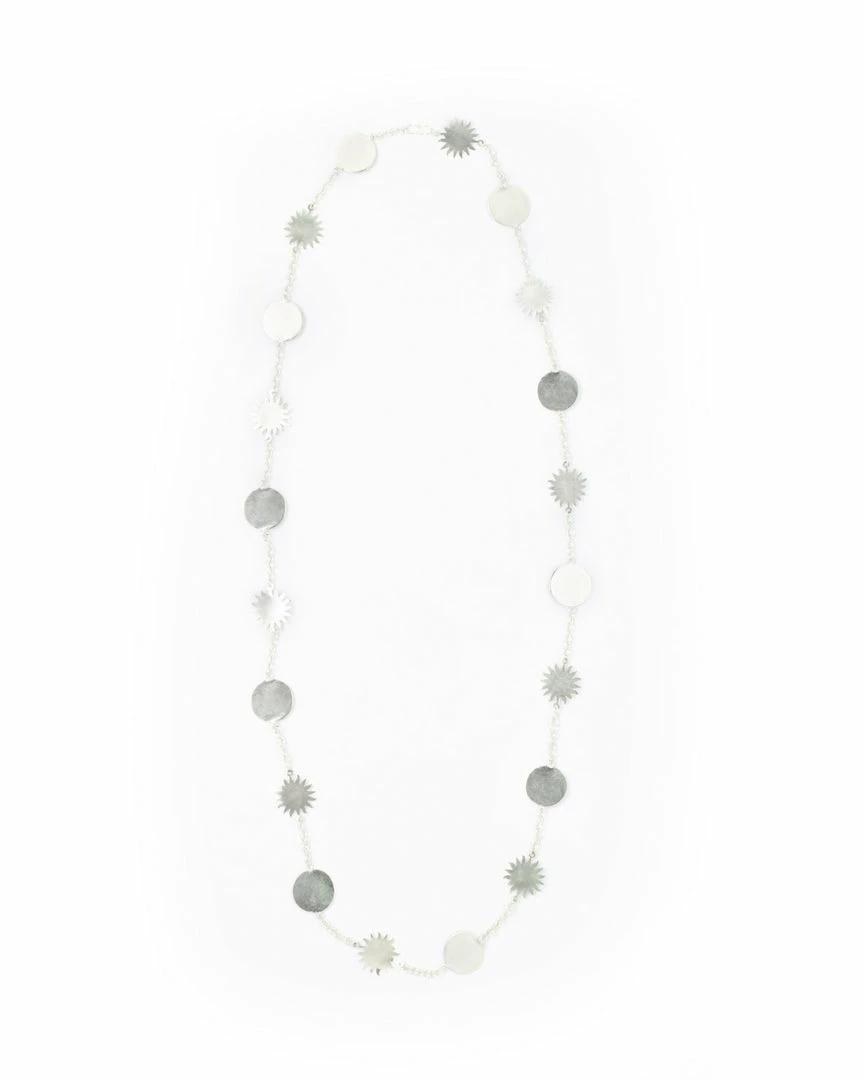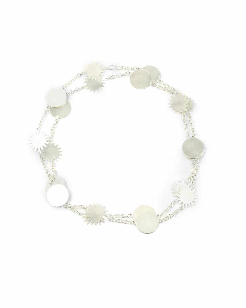 This piece features a crossed-chest chain studded with multiple hand-cut, sun-shaped plates. You can wear it as a bandolera or double-chain short necklace. The piece has a versatile design. Depending on your style, you can use it as an everyday piece or occasional accessory to go with funky fits.