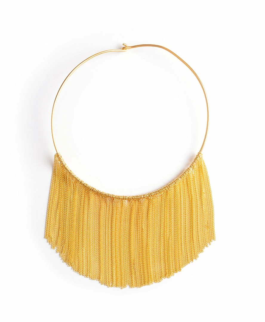 This piece will make you feel powerful and confident by creating the illusion of a gold curtain draping down your collarbones and chest making you shine like the star that you are.
