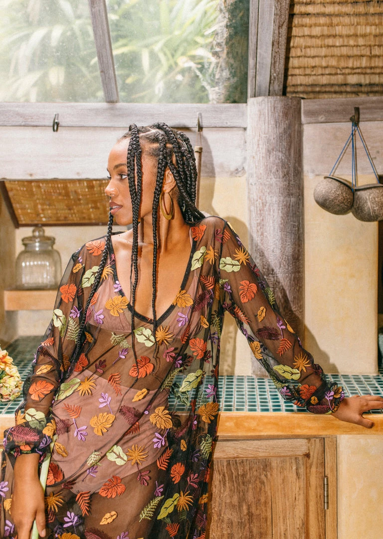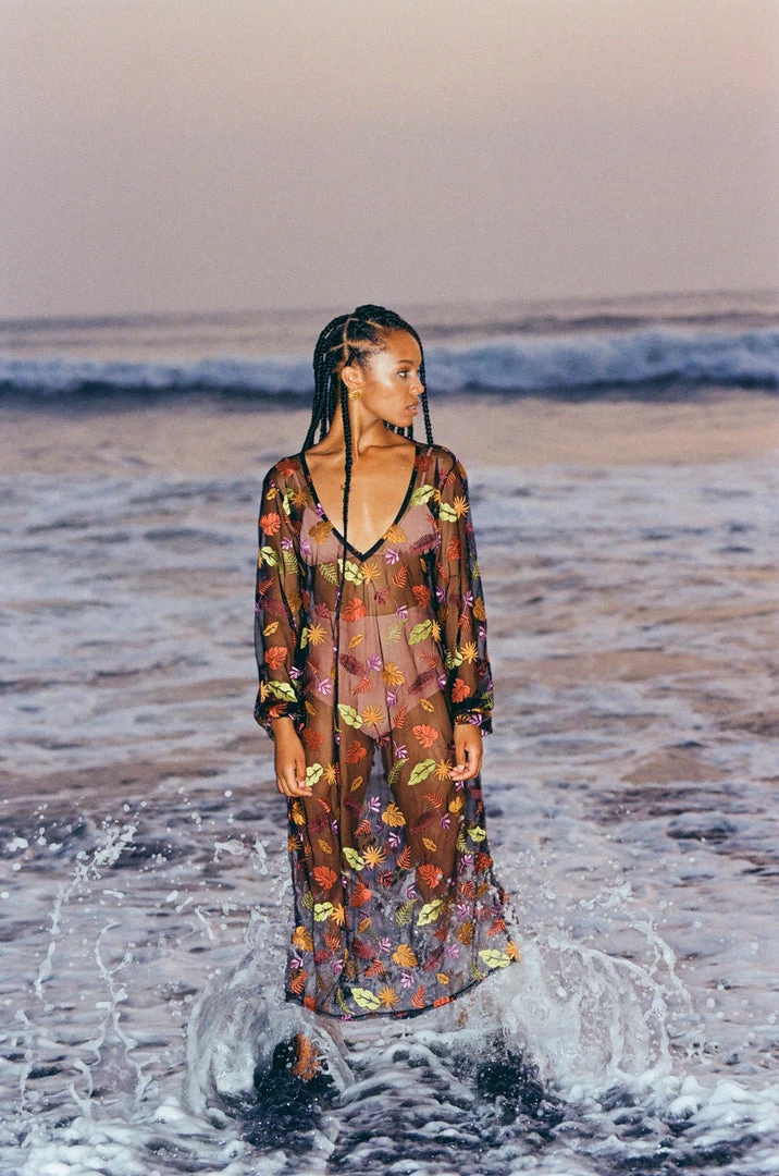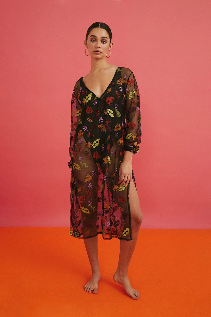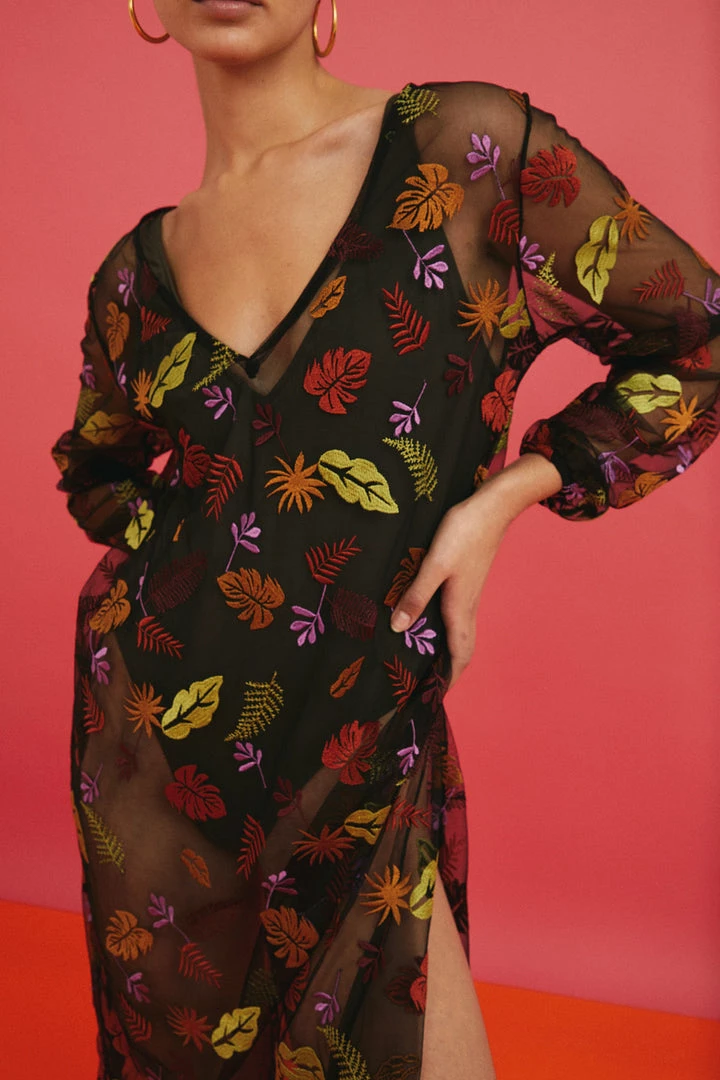 Magic fairy dress for summer lovers.A Complete long sleeves see-through dress with tropical flowers embroided details all around and side cuts on the bottom. Feel warm in this island style tunic dress going to the beach or having a dancing night out. style with big statement earrings.